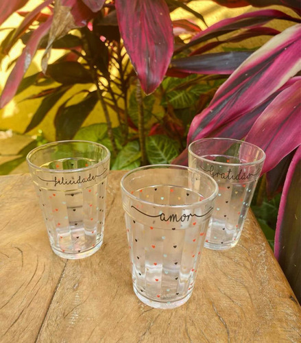 Lindos Copos Americanos de 190 ml decorados com corações coloridos e com as palavras Amor, Gratidão e Felicidade.Os coraçõezinhos coloridos dão um charme especial aos copos. São ideias para servir seus convidados.Os copos são práticos, resistentes e de fácil limpeza.Ao realizar a compra envie nos uma mensagem dizendo a palavra desejada.Podem ir ao microondas e lava louça.Informações :Material: VidroQuantidade: 30 unidades Capacidade: 190 mlTamanhos : Diâmetro 6,7 cm e Altura 9,3 cm.