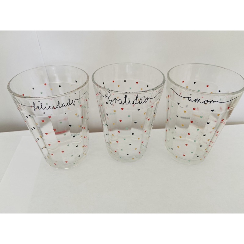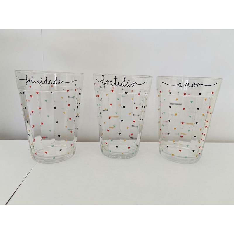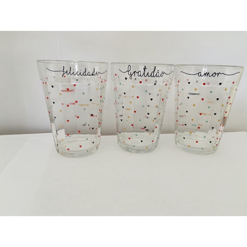 ✨Lindos Copos Americanos de 190 ml decorados com corações coloridos e com as palavras Amor, Gratidão e Felicidade.Os coraçõezinhos coloridos dão um charme especial aos copos. São ideias para servir seus convidados.Os copos são práticos, resistentes e de fácil limpeza.❤️Podem ir ao micro-ondas e lava louça.✨Informações :Quantidade: 4 unidades Capacidade: 190 mlTamanhos : Diâmetro 6,7 cm e Altura 9,3 cm.