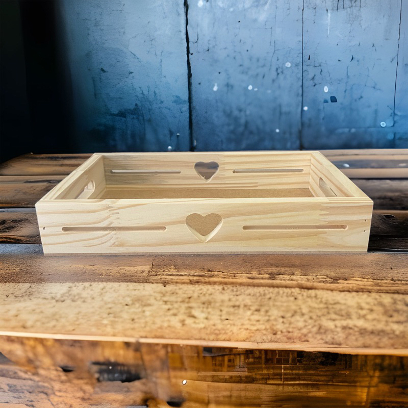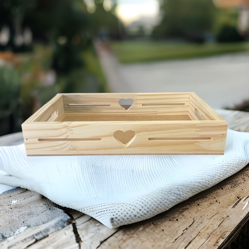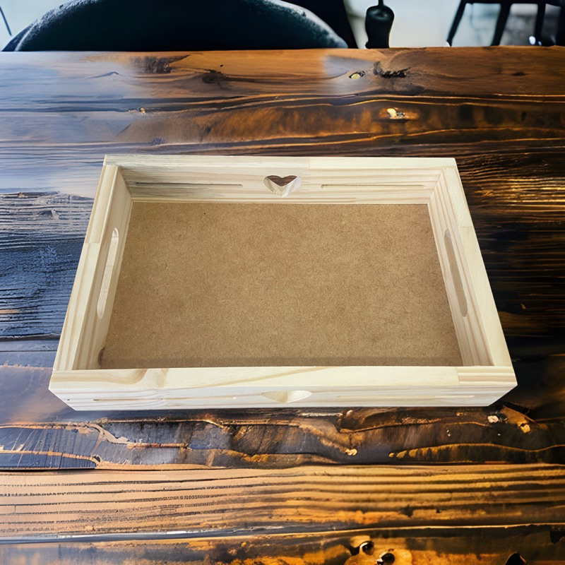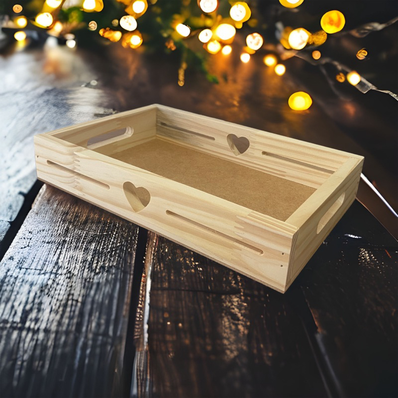 Linda bandeja de pinus com detalhe de coração! Super segura e resistente! Ótimo acabamento.Esse produto é uma ótima opção para decorar o seu cantinho de café. Adquira já a sua!DESCRIÇÃO:- Bandeja de madeira com abertura lateral para facilitar a pegada.- Tamanho: 20 largura x 30 comprimento x 5cm altura.- Material Madeira Pinus Natural.