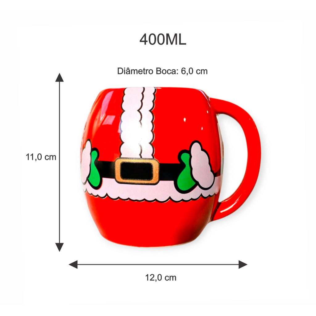 Entre no clima natalino com esta caneca exclusiva de porcelana 400ml.Com design vibrante e temático, ela traz de um lado a mensagem Feliz Natal e do outro a estampa divertida do traje do Papai Noel, perfeita para deixar seus momentos ainda mais especiais.Ideal para café, chá, chocolate quente ou até como item decorativo, essa caneca é uma ótima opção para presentear familiares, amigos e colegas.Detalhes técnicos:Material: Porcelana de alta qualidadeVolume: 400mlAltura: 11,0 cmLargura: 12,0 cmDiâmetro da boca: 6,0 cmCor: Vermelha com estampa natalinaGaranta já a sua e deixe seu Natal mais aconchegante, alegre e cheio de estilo!