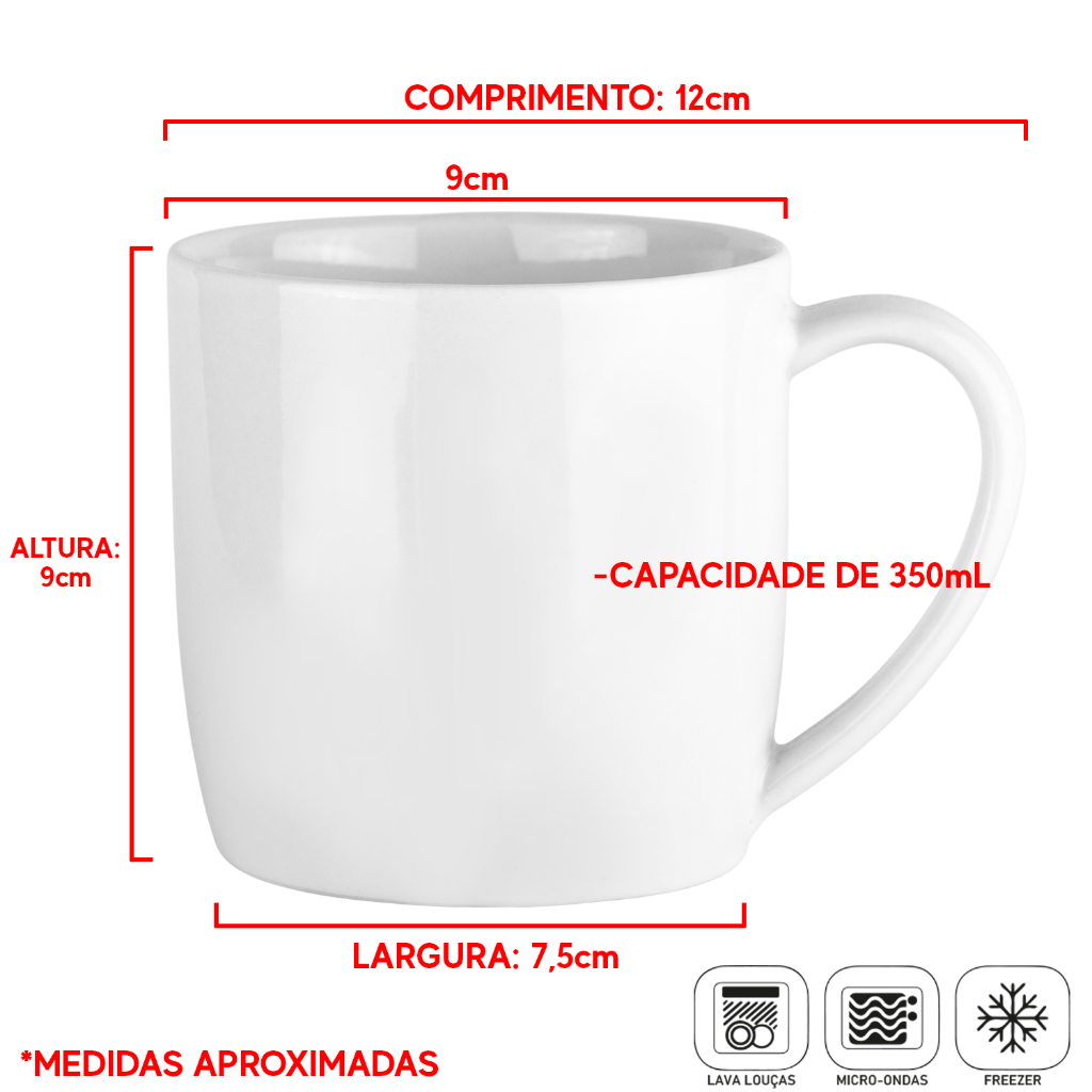 Transforme seus momentos de pausa em instantes de aconchego com esta caneca de porcelana 350mL. Ideal para café, chá, leite ou cappuccino, ela possui formato ergonômico que proporciona uma pegada confortável e segura. O acabamento liso e brilhante traz um visual moderno, perfeito para compor seu cantinho do café, escritório ou cozinha.Prática e resistente, pode ser usada no micro-ondas, lava louças e freezer, facilitando o dia a dia sem perder a durabilidade.Medidas aproximadas:• Altura: 9cm• Largura (corpo): 7,5cm• Comprimento total com alça: 12cm• Capacidade: 350mLUma peça versátil, ideal para uso diário, para presente criativo ou para complementar sua coleção de canecas decoradas.Palavras-chave:caneca porcelana, caneca café, caneca 350ml, caneca chá, caneca cappuccino, caneca presente, caneca cozinha, caneca cantinho do café, caneca resistente, caneca micro-ondas, caneca lava louças, caneca freezer, caneca branca, caneca dia a dia.