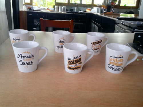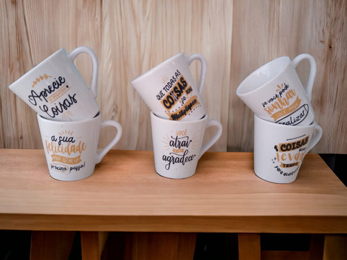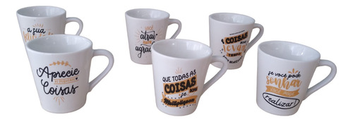 Jogo 6 Caneca Café Porcelana Kit Xícaras Frases Douradas Branco