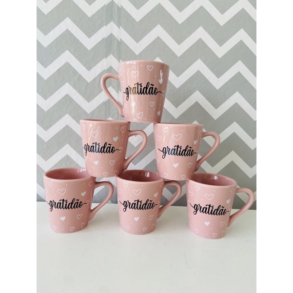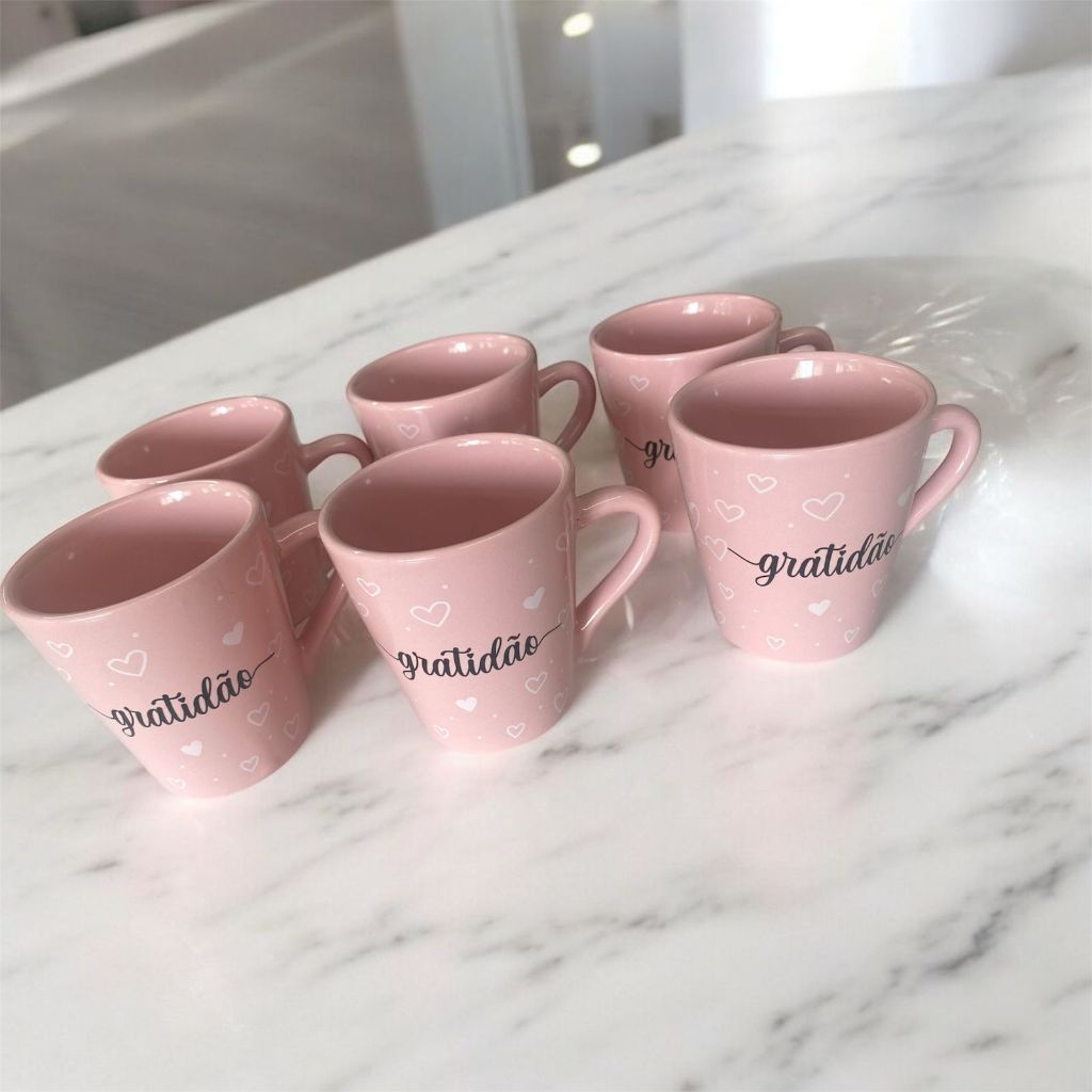 Jogo 6 Xícaras/ Caneca Café Porcelana Rosa Decorada Gratidão
