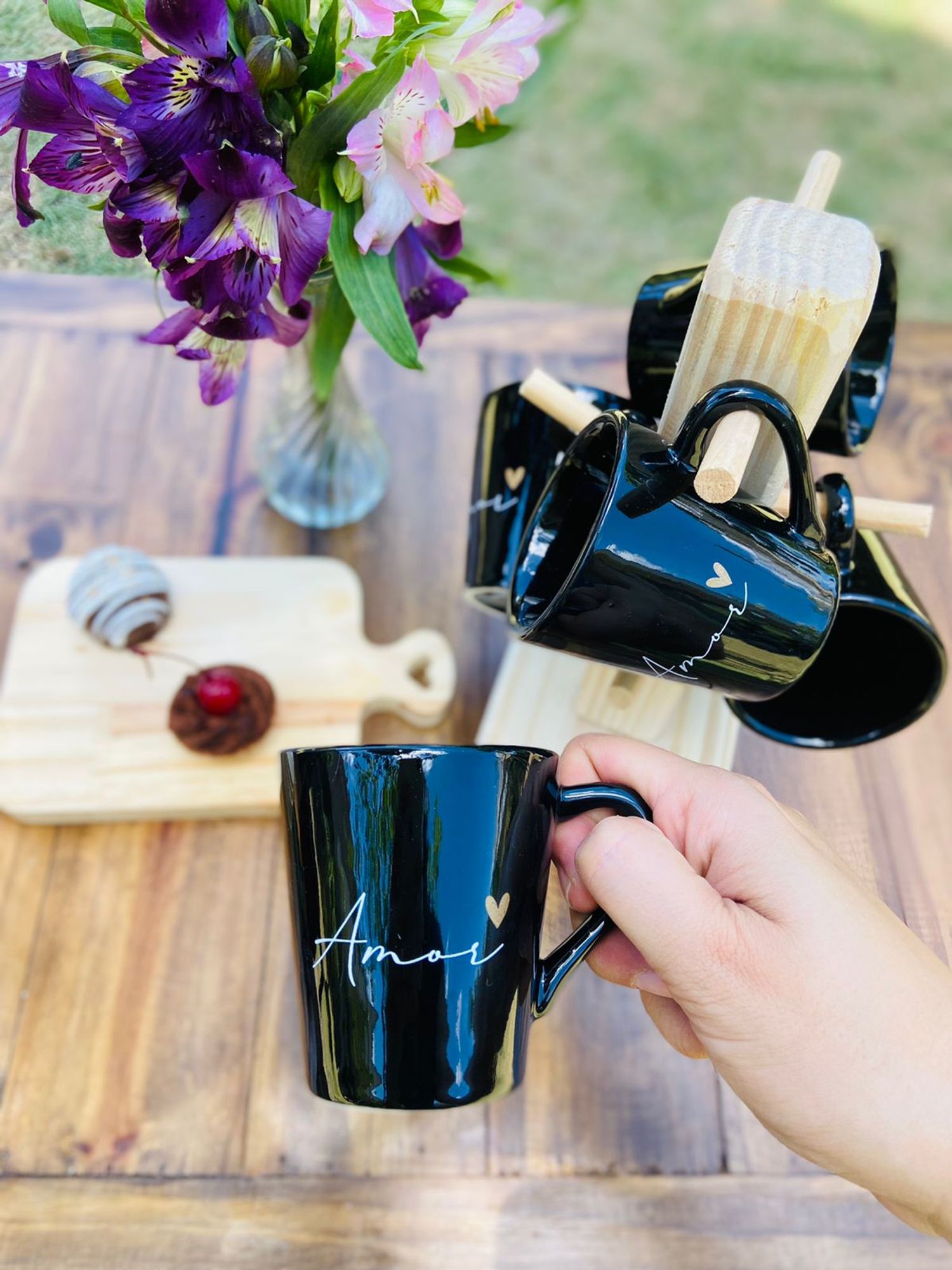 Jogo 6 Xícaras/caneca Porcelana Preta Com Suporte Em Madeira Pinus
