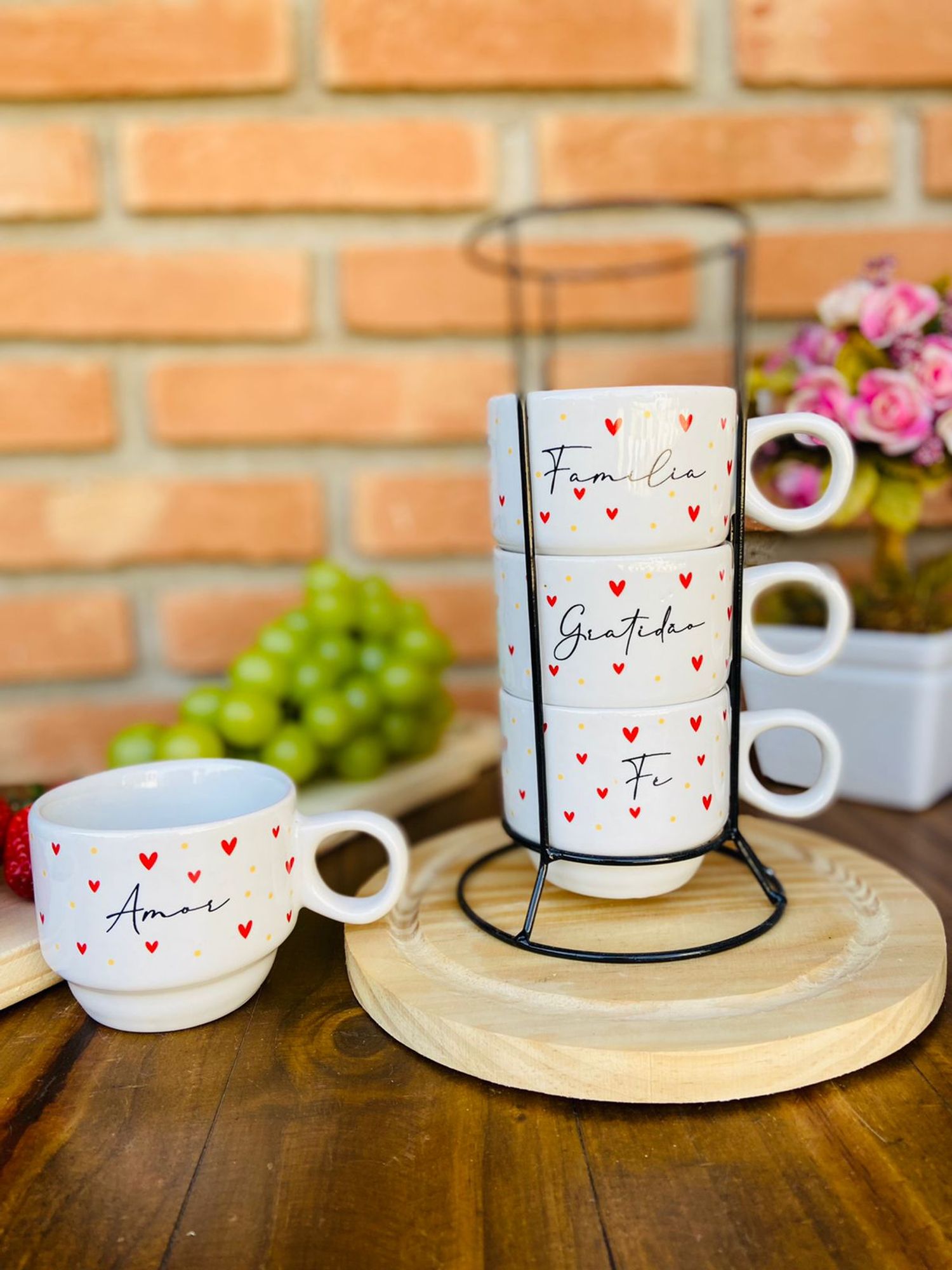 Esse kit em porcelana é o que você procurava para deixar sua cozinha perfeita e compor uma linda mesa de café e surpreender a todos. As frases são lindas ! Esse produto é uma ótima opção para presentear as pessoas que amamos. Os produtos são seguros para ir ao micro-ondas e máquina de lavar. FICHA TÉCNICA - Quantidade: 4 Xícaras - Material: Porcelana - Acabamento: esmaltado na cor branca e decorada com corações vermelhos, escrita preta e pontinhos dourados. - Capacidade: 150 ml cada xícara - Dimensões em cm: - Altura: 7 - Diâmetro boca: 7 Suporte: - Material: Aço - Altura Aproximada: 21 cm INFORMAÇÕES ADICIONAIS Nossas fotos são do produto real. EMBALAGEM Os produtos são embalados com muito cuidado para que você receba seu pedido em perfeito estado. Se mesmo assim sofrer algum dano durante o transporte, não se preocupe! É só entrar em contato conosco.