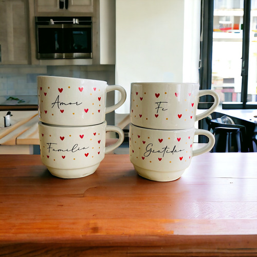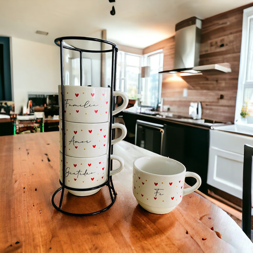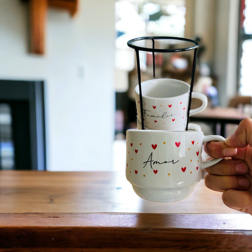 Esse kit em porcelana é o que você procurava para deixar sua cozinha perfeita e compor uma linda mesa de café e surpreender a todos. As frases são lindas ! Esse produto é uma ótima opção para presentear as pessoas que amamos.Os produtos são seguros para ir ao micro-ondas e máquina de lavar.FICHA TÉCNICA- Quantidade: 4 Xícaras- Material: Porcelana- Acabamento: esmaltado na cor branca e decorada com corações vermelhos, escrita preta e pontinhos dourados.- Capacidade: 200 ml cada xícara- Dimensões em cm:- Altura: 8- Diâmetro boca: 8Suporte:- Material: Aço- Altura Aproximada: 27 cmINFORMAÇÕES ADICIONAISNossas fotos são do produto real.EMBALAGEMOs produtos são embalados com muito cuidado para que você receba seu pedido em perfeito estado.Se mesmo assim sofrer algum dano durante o transporte, não se preocupe! É só entrar em contato conosco.