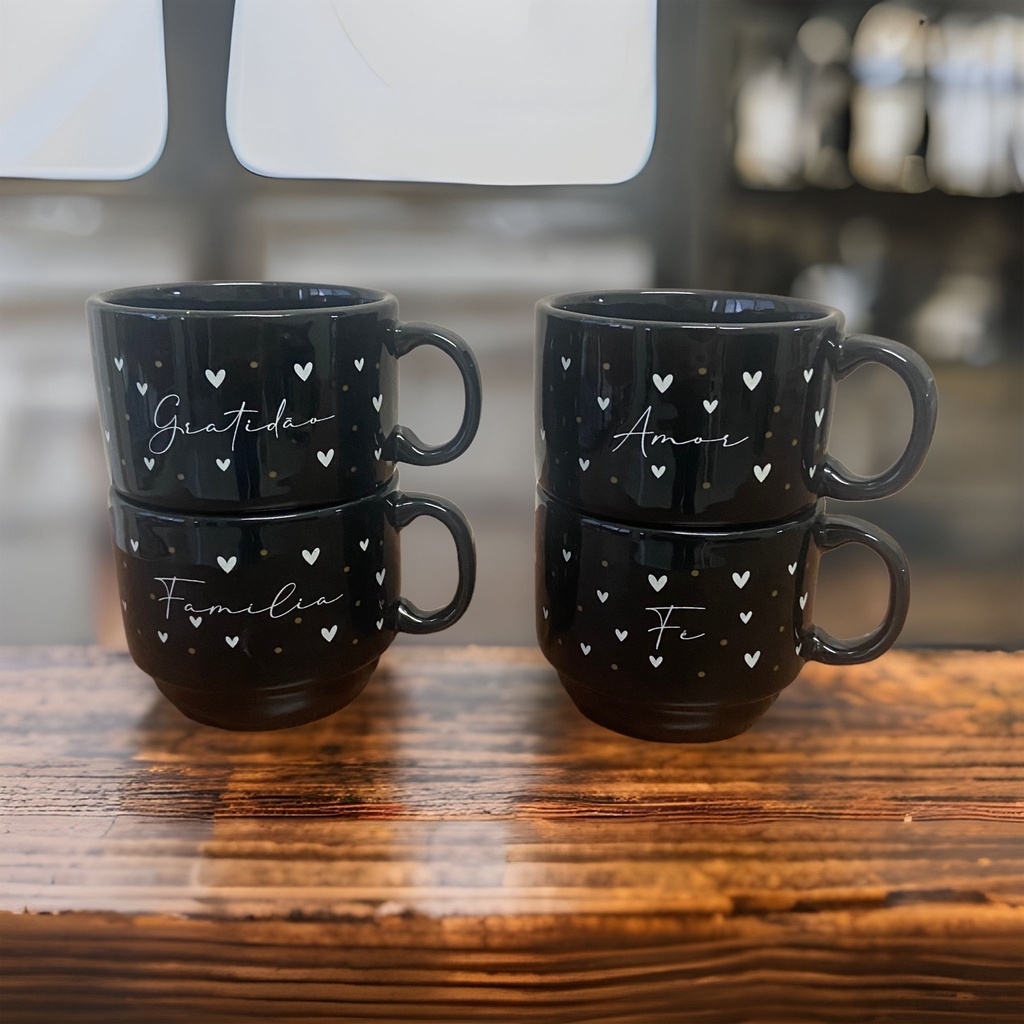 Kit 4 Xícaras Pretas com Frases + Suporte ? Estilo e carinho na sua mesa de café!Características do produto:✅ 4 xícaras de porcelana preta decoradas com frases✅ Capacidade de 200 ml — ideal para café ou chá✅ Medidas: 7 cm de altura x 7 cm de diâmetro✅ Acompanha suporte de aço com 21 cm de altura✅ Podem ir ao micro-ondas e lava-louças✅ Perfeito para presentear quem você amaVocê vai receber em sua casa:? 4 xícaras pretas de porcelana com frases? 1 suporte de aço para organizaçãoRecomendações de Uso:? Use para compor uma mesa charmosa e acolhedora? Lave com cuidado para preservar as frases decorativas? Mantenha o suporte em local seco para evitar oxidação