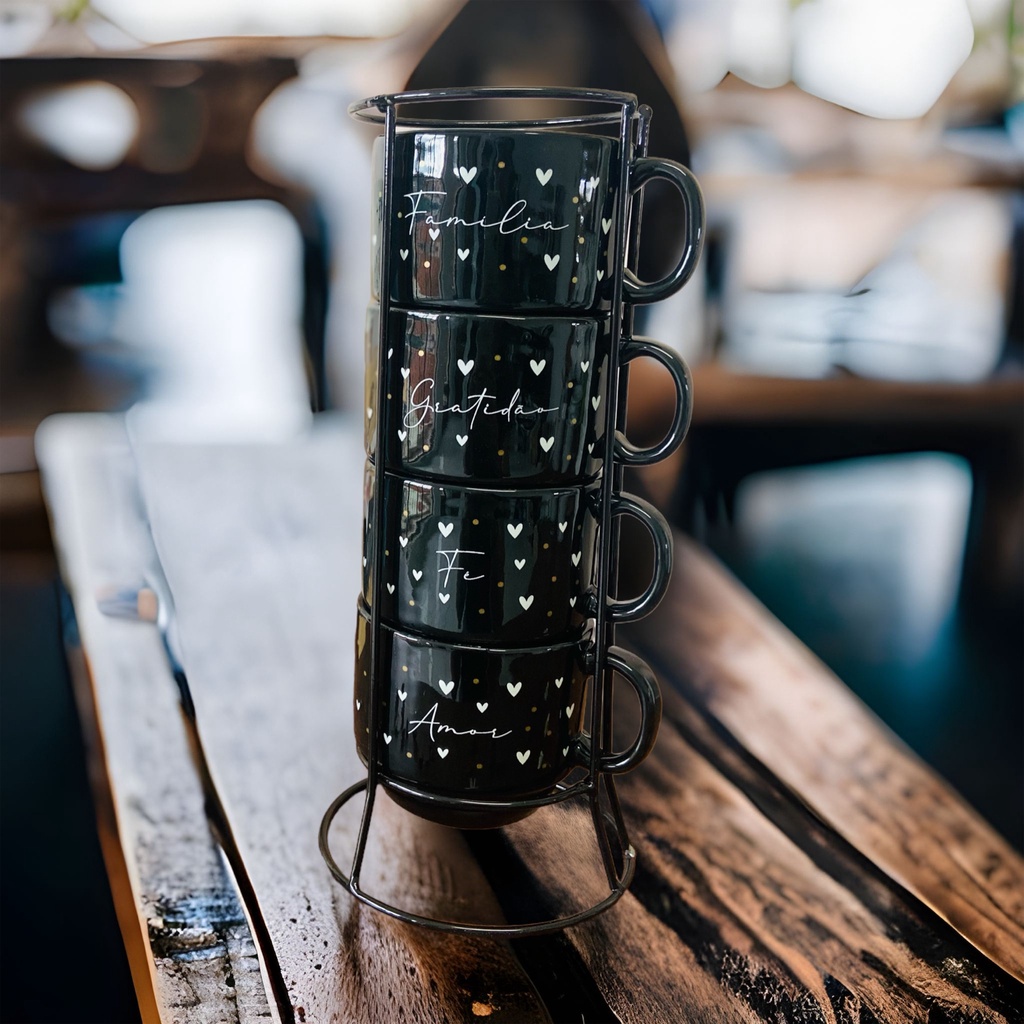 Jogo De 4 Xícaras Porcelana Preta Fé Familia + Suporte Metal Kit
