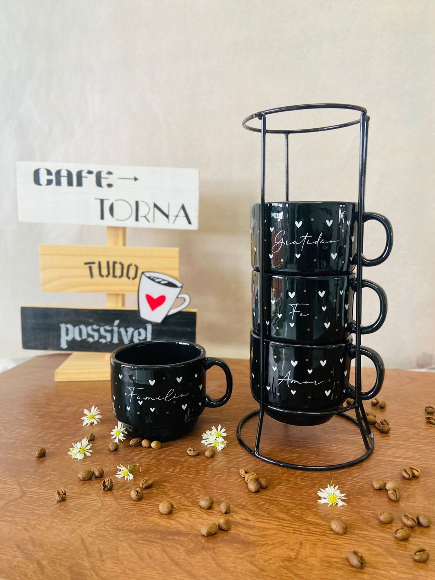Jogo De 4 Xícaras Porcelana Preta Frases + Suporte Metal Kit