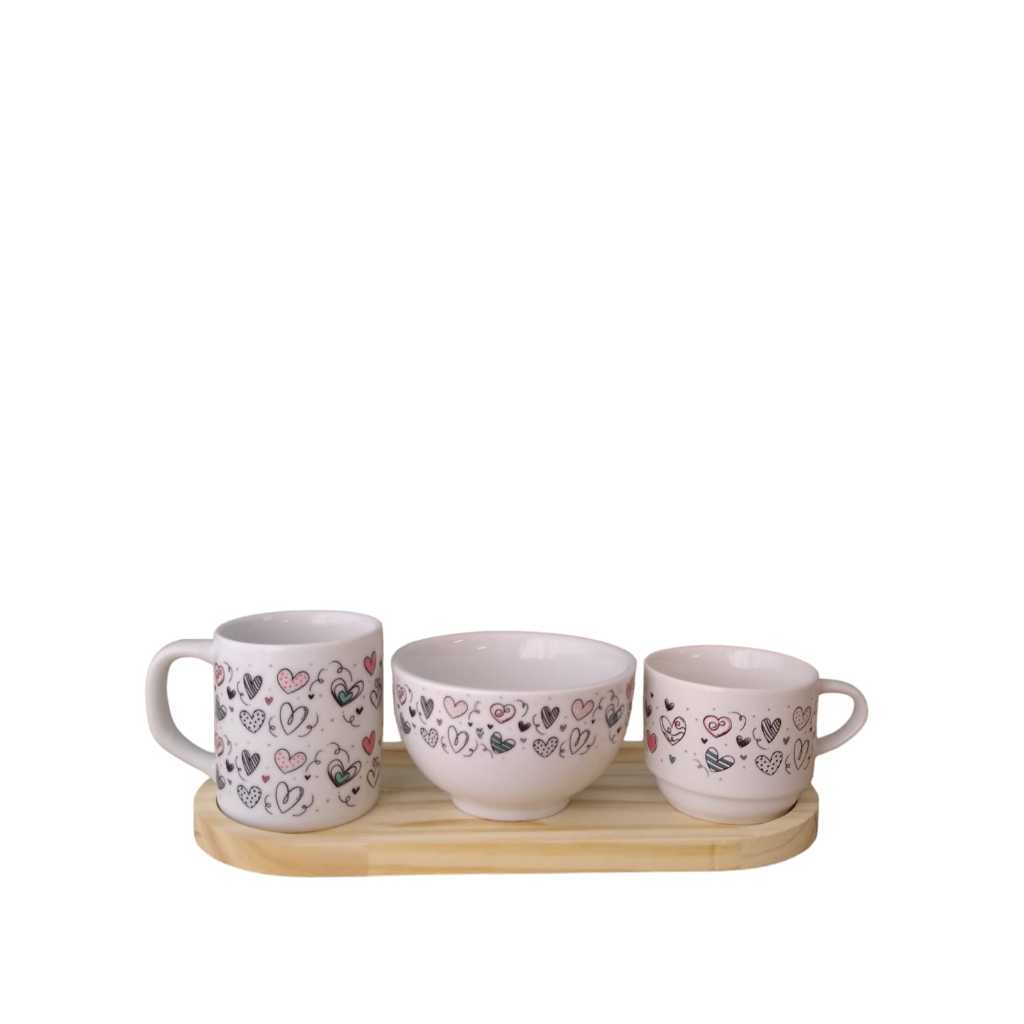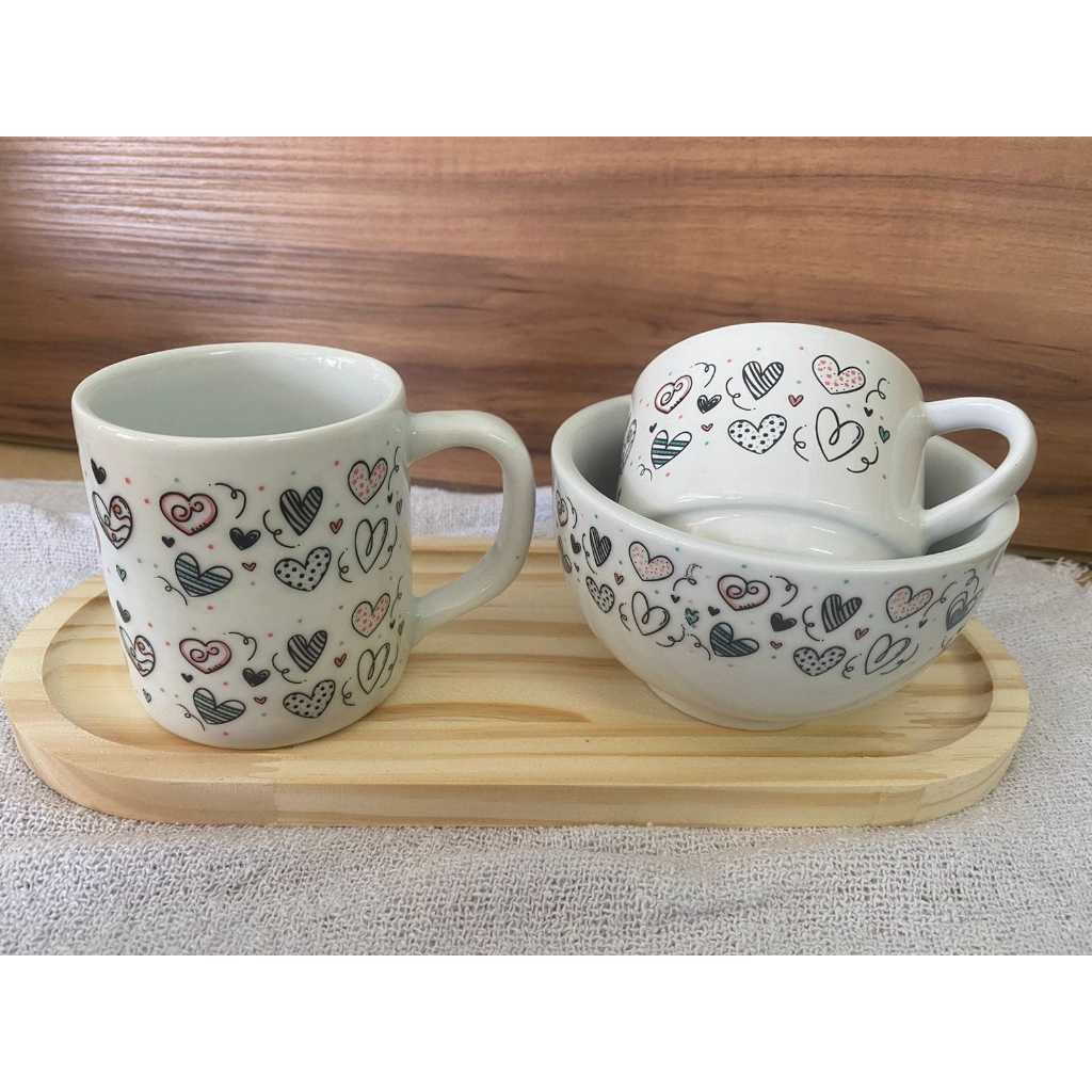 Jogo de Xícara Chá Caneca Café e Tigela em Porcelana Decorada com Bandeja de Pinus