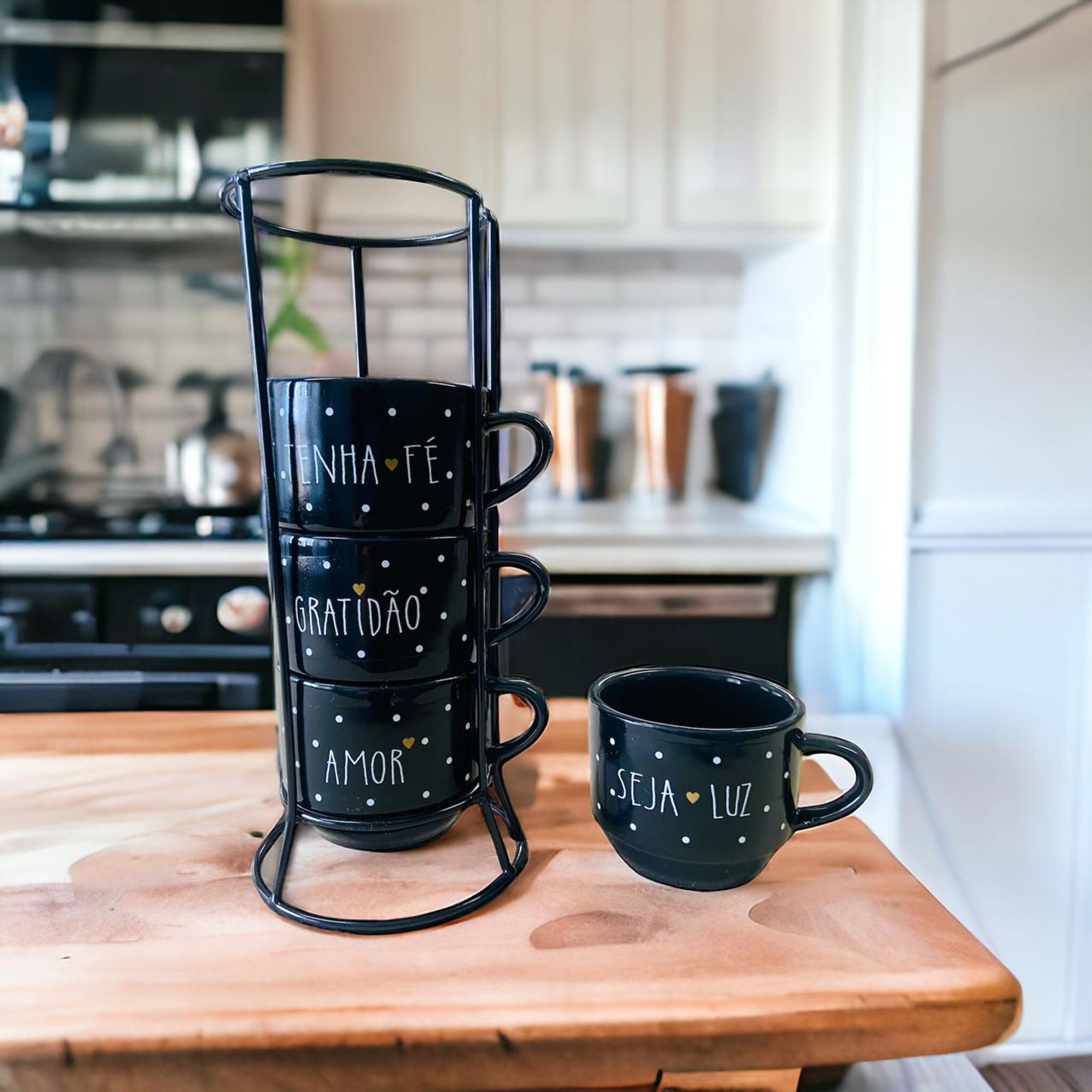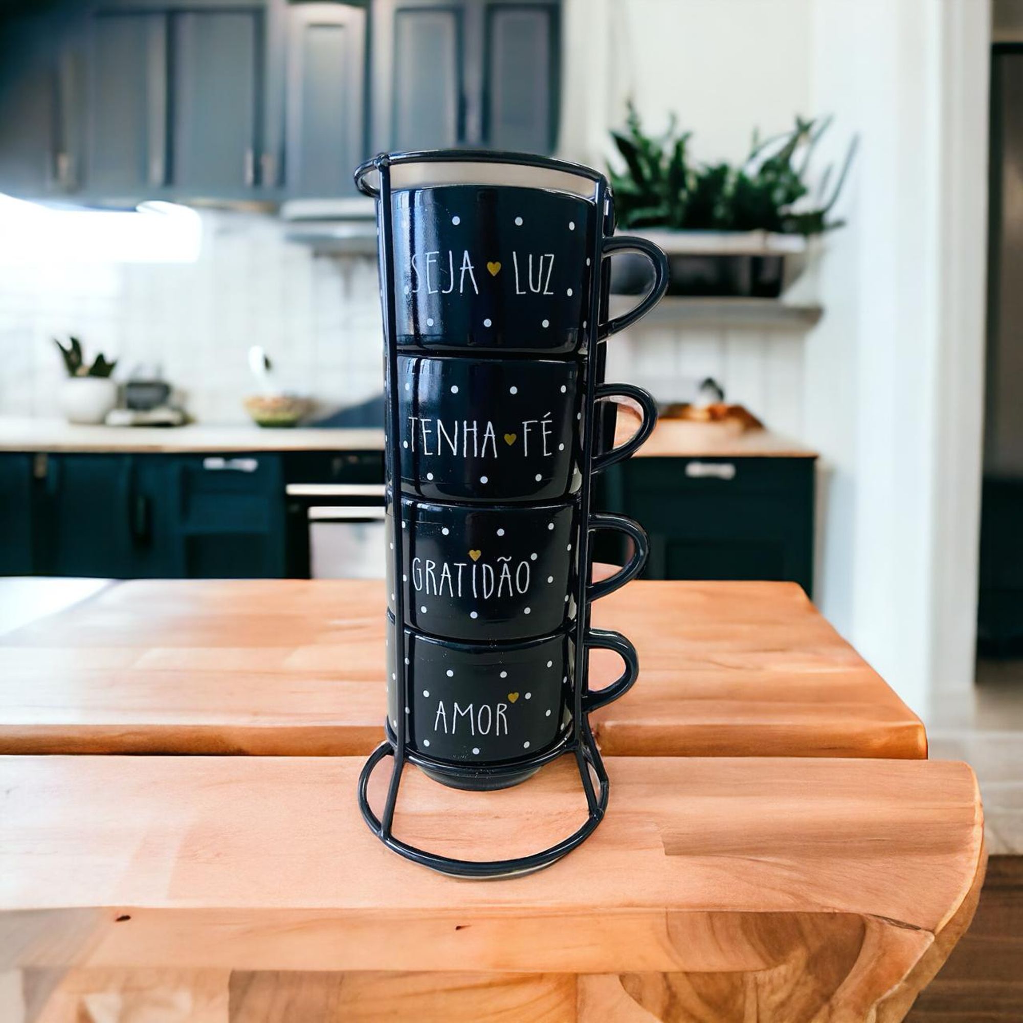 Esse kit em porcelana é o que você procurava para deixar sua cozinha perfeita e compor uma linda mesa de café e surpreender a todos. As palavras motivacionais são lindas ! Esse produto é uma ótima opção para presentear as pessoas que amamos. Os produtos são seguros para ir ao micro-ondas e máquina de lavar. FICHA TÉCNICA - Quantidade: 4 Xícaras - Material: Porcelana - Capacidade: 200 ml - Dimensões em cm: - Altura: 7 - Diâmetro boca: 8 Suporte: - Material: Aço - Altura Aproximada: 27 cm INFORMAÇÕES ADICIONAIS Nossas fotos são do produto real. EMBALAGEM Os produtos são embalados com muito cuidado para que você receba seu pedido em perfeito estado. Se mesmo assim sofrer algum dano durante o transporte, não se preocupe! É só entrar em contato conosco.