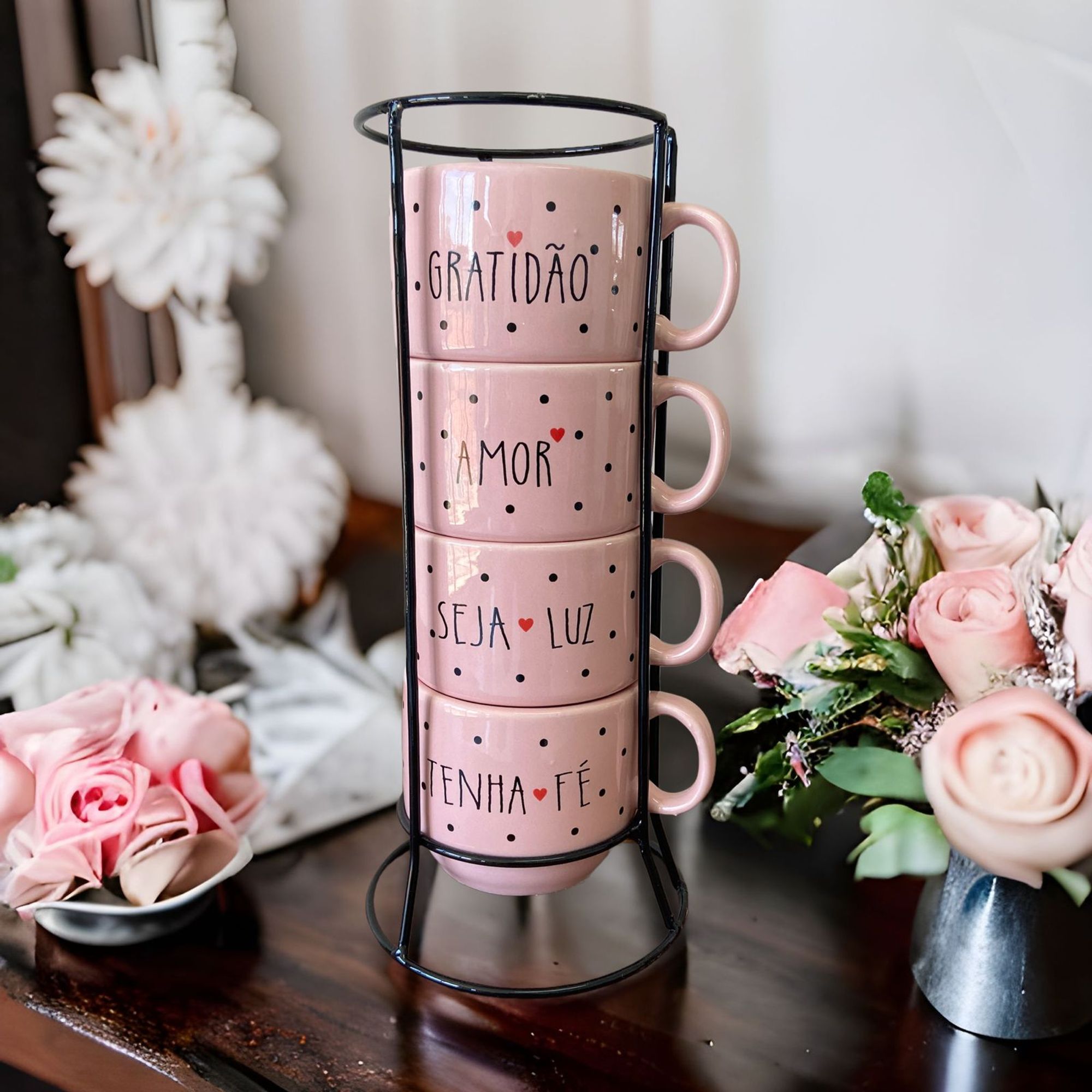 Jogo De Xícaras Café Chá Rosa Com Suporte Kit 4 Canecas Poá