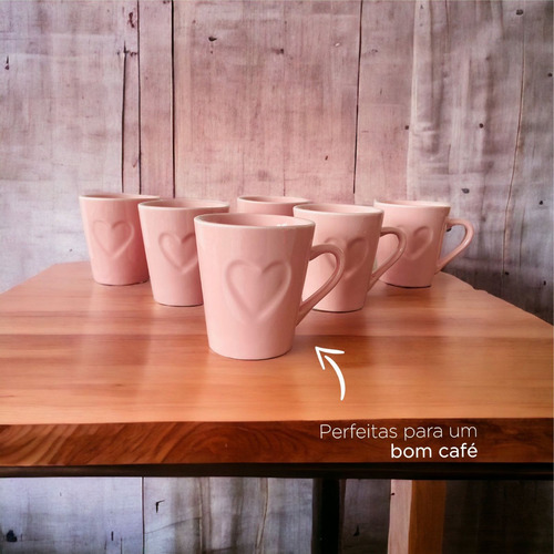 Kit com 6 unidades de canecas em porcelana com detalhe em coração em relevo! As canecas são lindas e a cor rosa claro trouxe ainda mais delicadeza ao produto.As canecas são ideias para tomar um bom café.Compre agora e presentei quem você ama.Ficha Técnica:Quantidade: 6Capacidade: 120 mlMaterial: PorcelanaMedidas: 8 cm de altura e 6 cm de diâmetro.EMBALAGEMOs produtos são embalados com muito cuidado para que você receba seu pedido em perfeito estado. Se mesmo assim sofrer algum dano durante o transporte, não se preocupe! É só entrar em contato conosco ;)Produto 100% Nacional