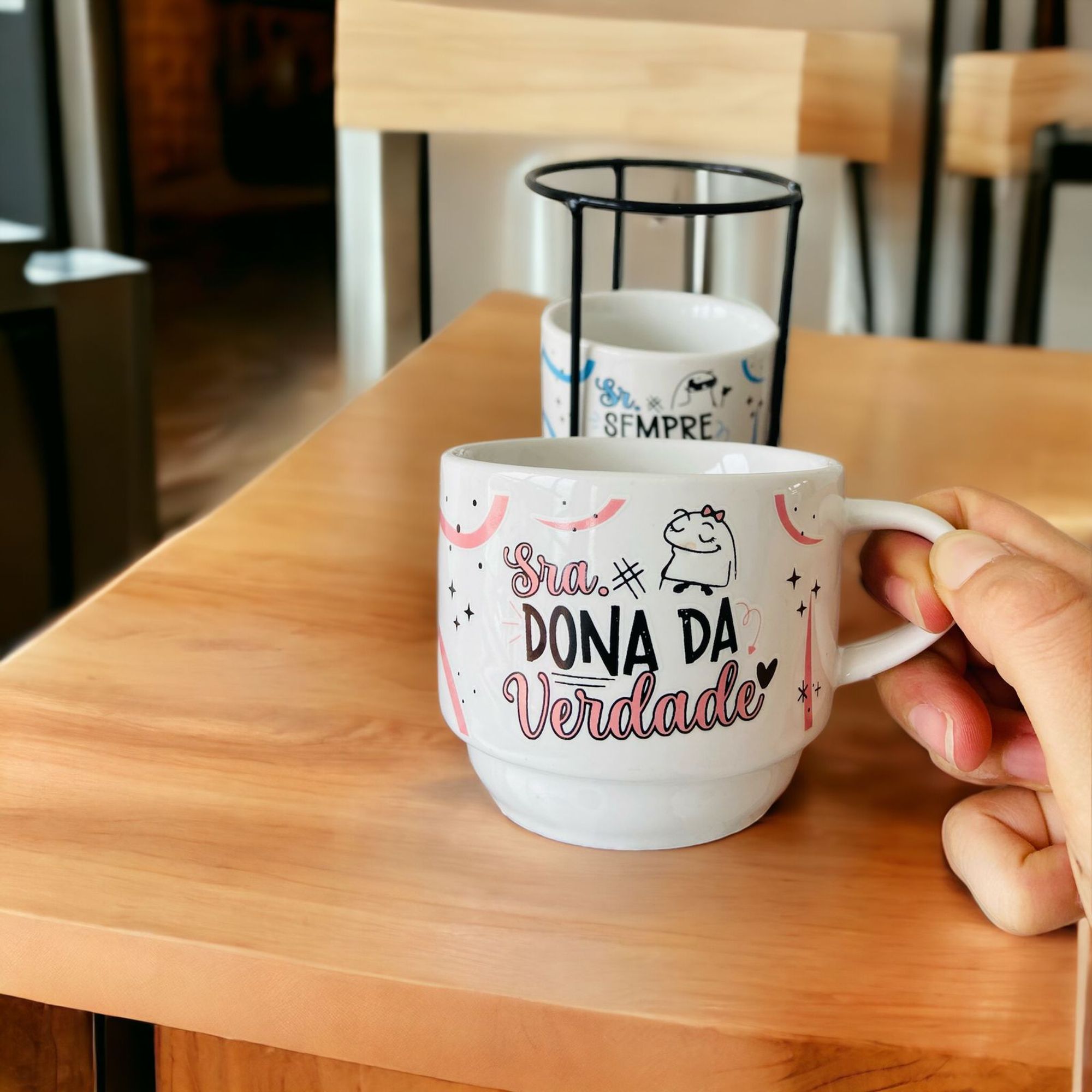 Faça do seu café matinal um ritual encantador com o charme exclusivo da Neo Porcelanas! Nossas xícaras são mais do que utensílios - são pequenos pedaços de alegria para alegrar seu dia a dia. As xícaras são decoradas com o personagem flork com as frases "Sr Sempre Certo" e "Sra Dona da Verdade". Ficha Técnica Quantidade : 2 xícaras. Capacidade : 200 ml. Altura da xícara: 7 cm. Diâmetro da boca: 8 cm. Material: Porcelana Cor: branca decorada . Acessório: Suporte preto de metal com 14 cm de altura.