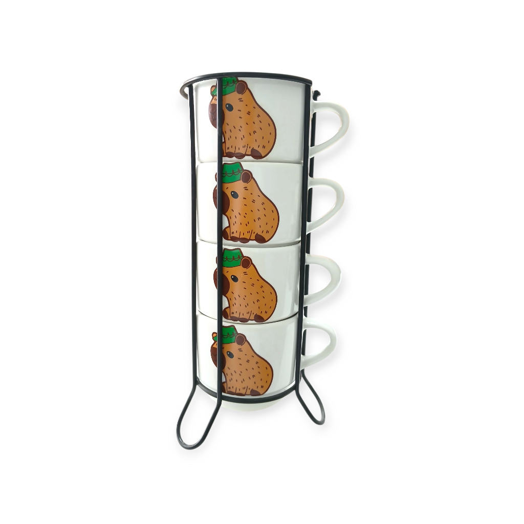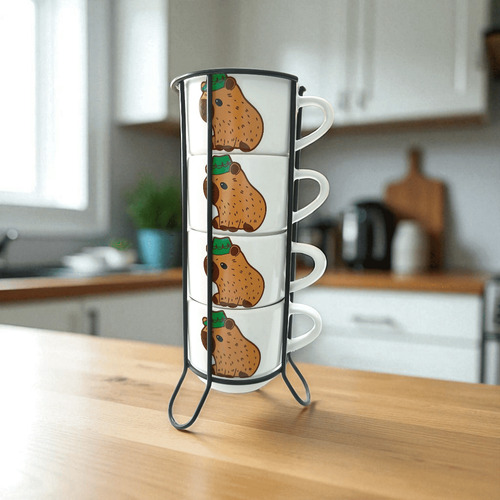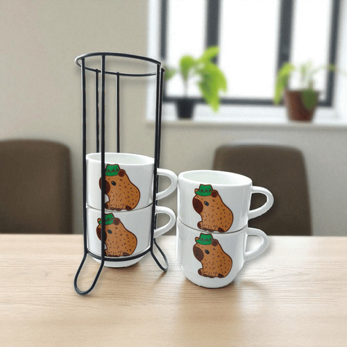 Descrição Persuasiva:Transforme seus momentos de café em pura diversão com este kit de 4 canecas empilháveis de porcelana decoradas com a charmosa capivara! Além de super funcionais, elas ocupam pouco espaço graças ao suporte metálico incluso, que mantém tudo organizado e com um visual moderno. Diferenciais:Estampa exclusiva e divertida da capivaraIdeal para café, chá, cappuccino e bebidas quentesÓtima opção de presente criativo e funcionalSuporte em metal incluso, garantindo organização e charme na sua cozinha Detalhes técnicos de cada caneca:Capacidade: 200mlAltura: 7,0cmComprimento (com alça): 11,5cmDiâmetro: 7,5cmMaterial: Porcelana de alta qualidade Perfeito para uso diário, para receber visitas ou para presentear alguém especial. Uma combinação de praticidade, beleza e exclusividade que vai deixar sua cozinha ainda mais encantadora!