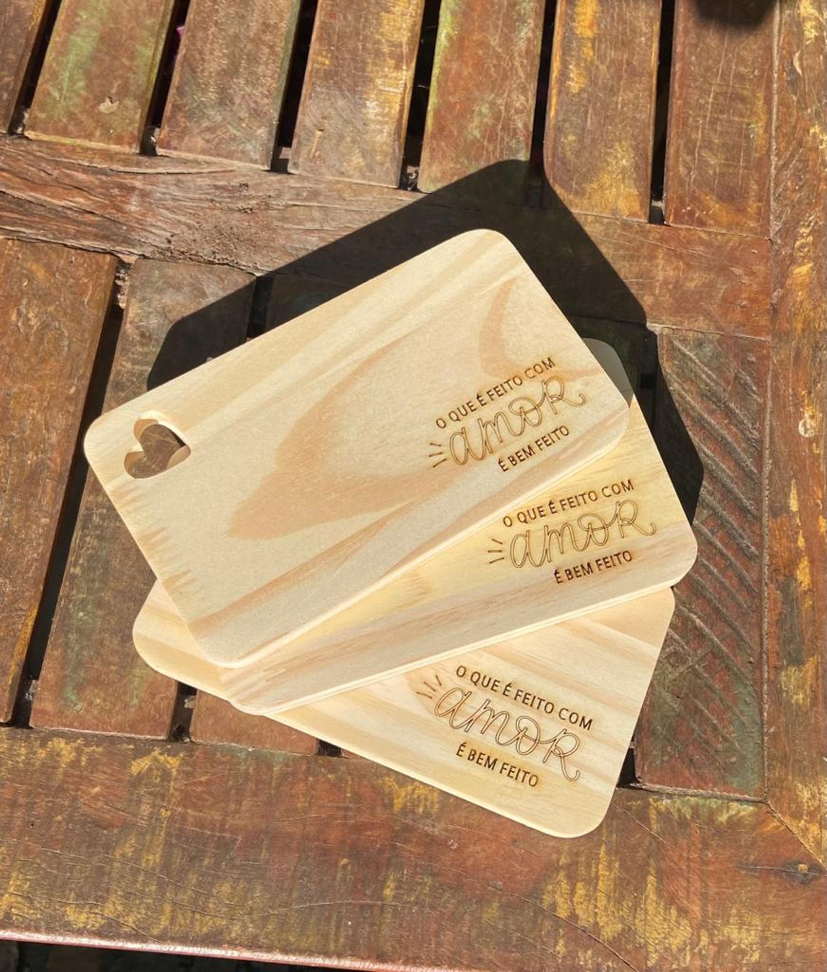 Kit com 4 tábuas retangulares de madeira pinus. As tábuas são muito práticas na hora de servir frios, petiscos e também como pires para xícaras. As peças são únicas e contam com a escrita " O que é feito com Amor é bem feito". Esse produto é ótimo para presentear. Ficha técnica: 4 unidades Medidas: 19 cm de comprimento e 11 de largura. Formato retangular com detalhe em coração.