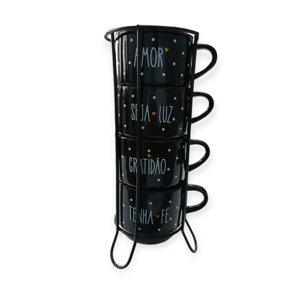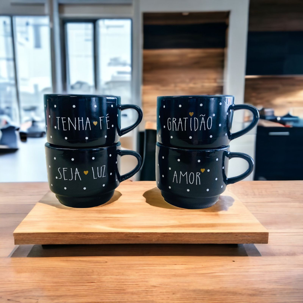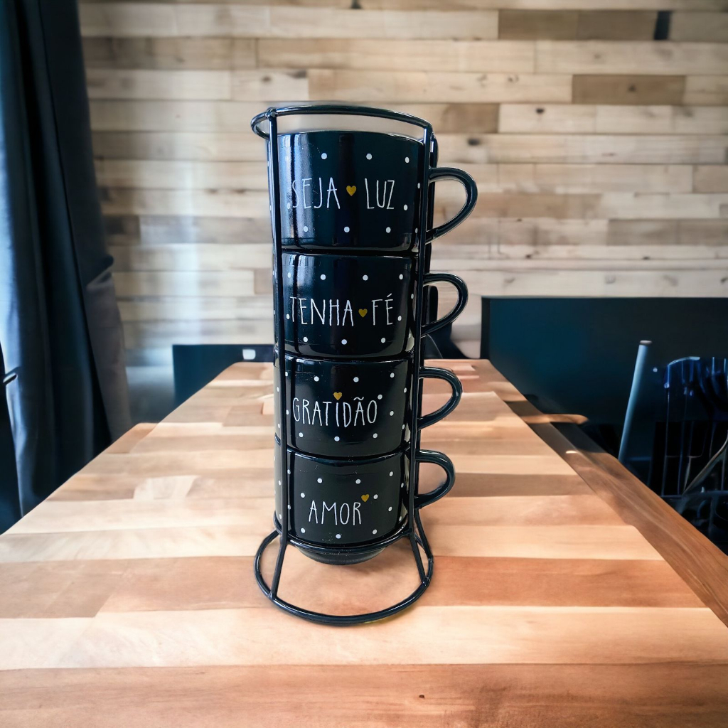 Kit 4 Xícaras Empilháveis de Porcelana Preta Poá com Suporte – Amor, Seja Luz, Gratidão, Tenha Fé