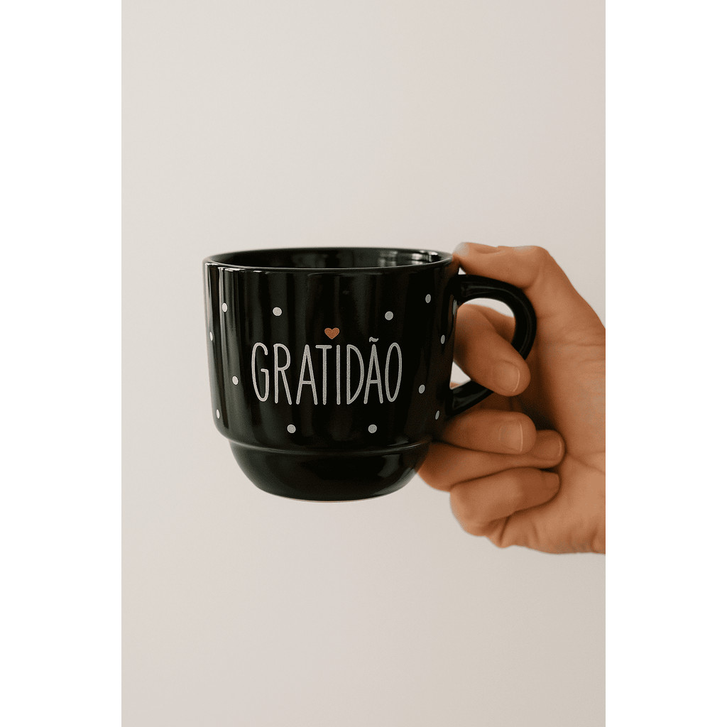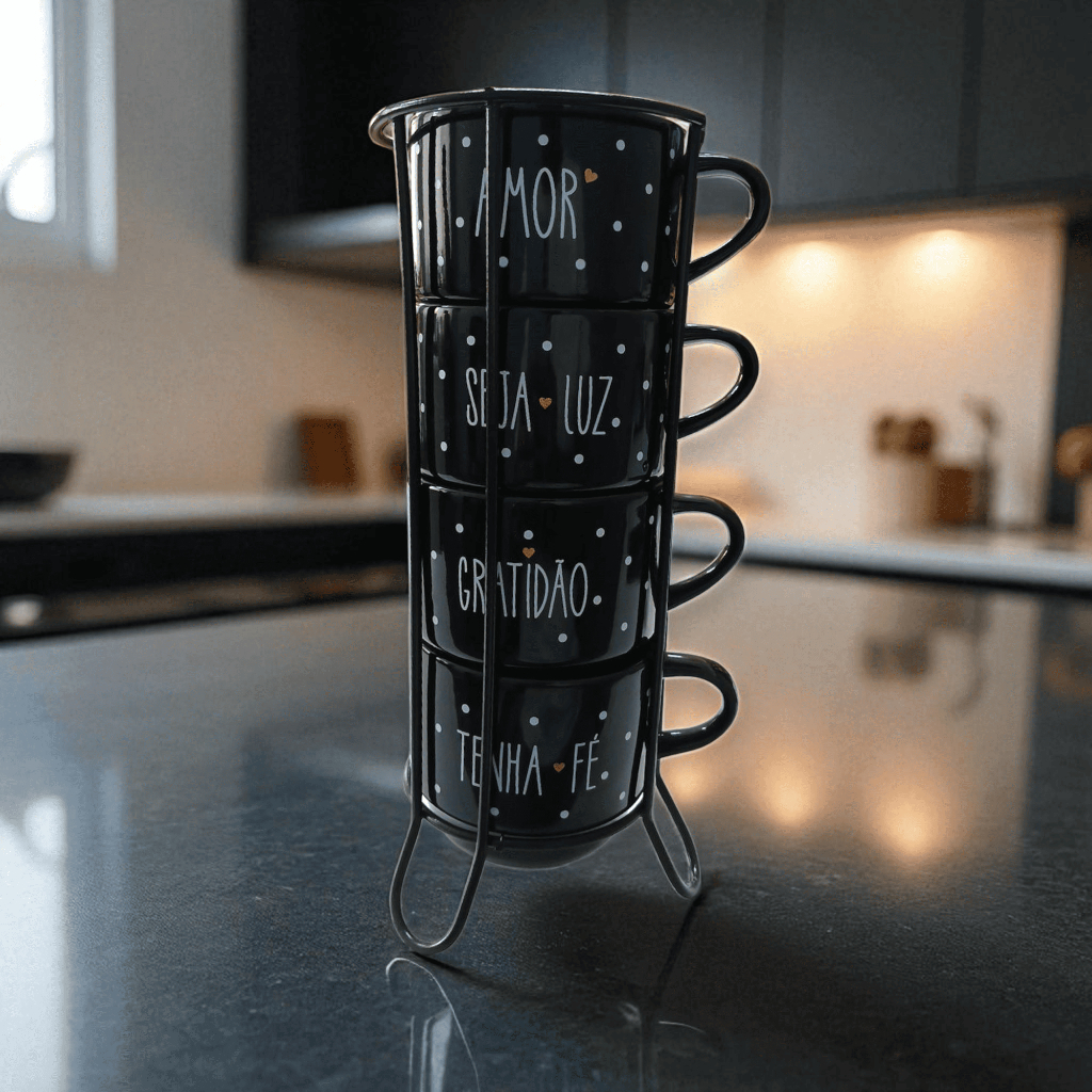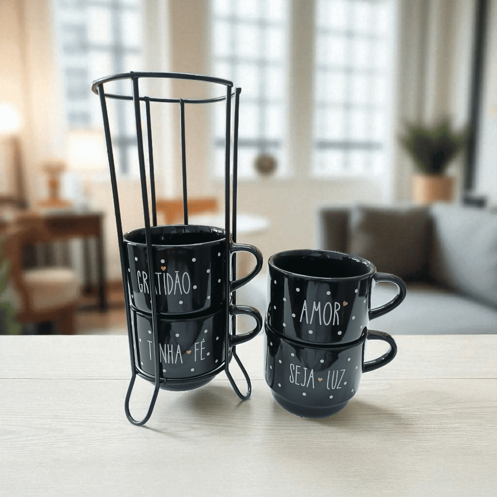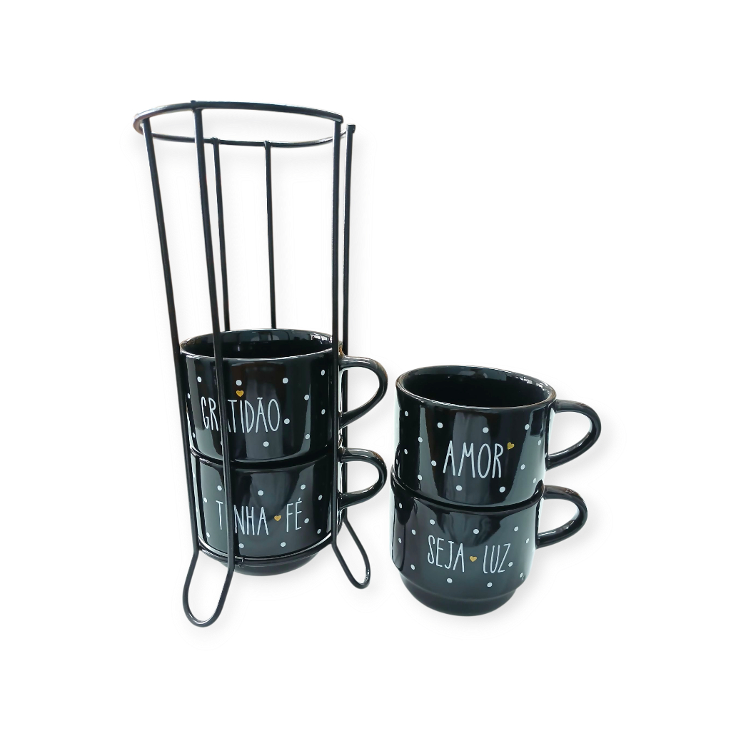 Kit 4 Xícaras Empilháveis de Porcelana Preta Poá com Suporte – Amor, Seja Luz, Gratidão, Tenha Fé