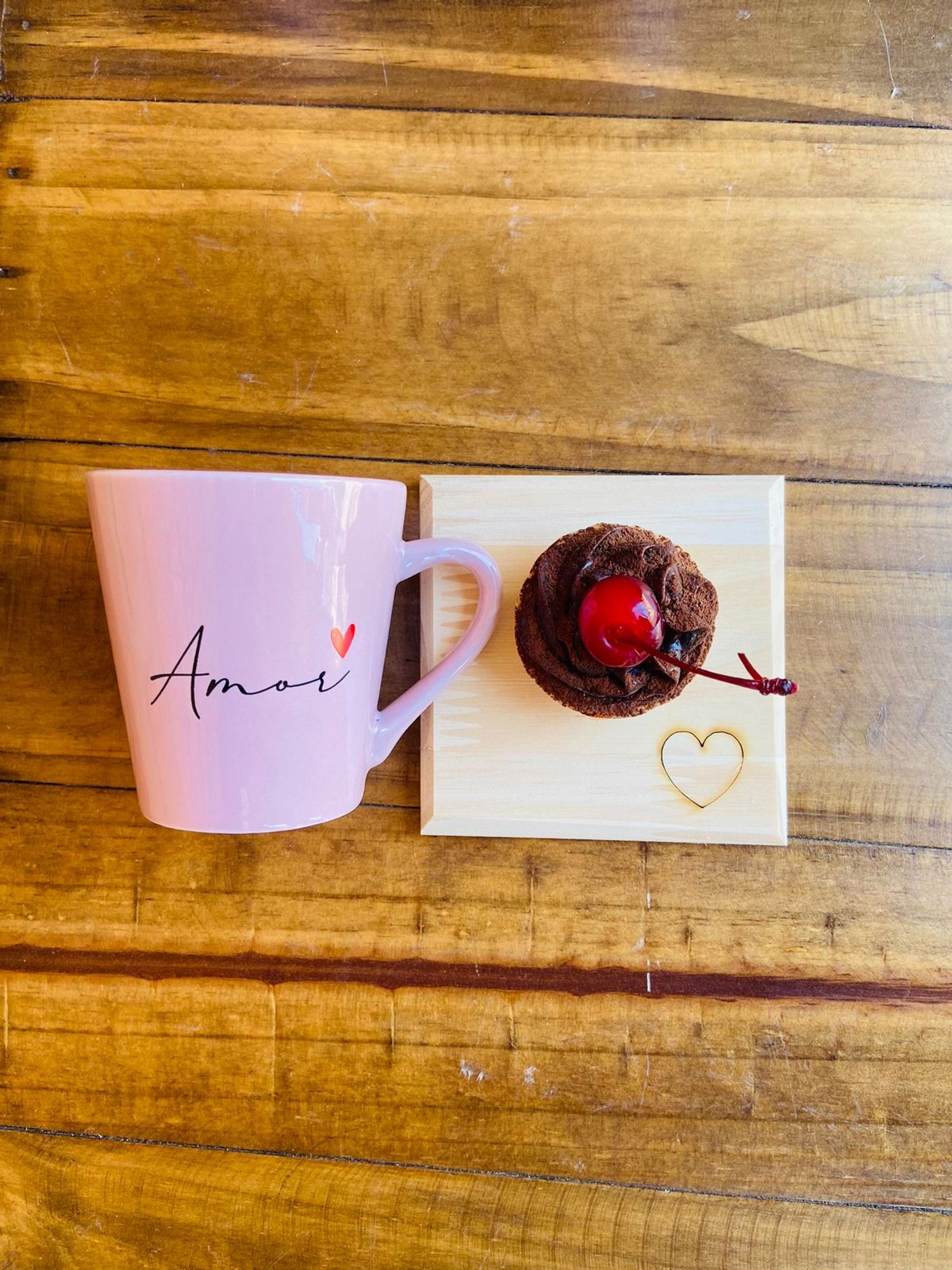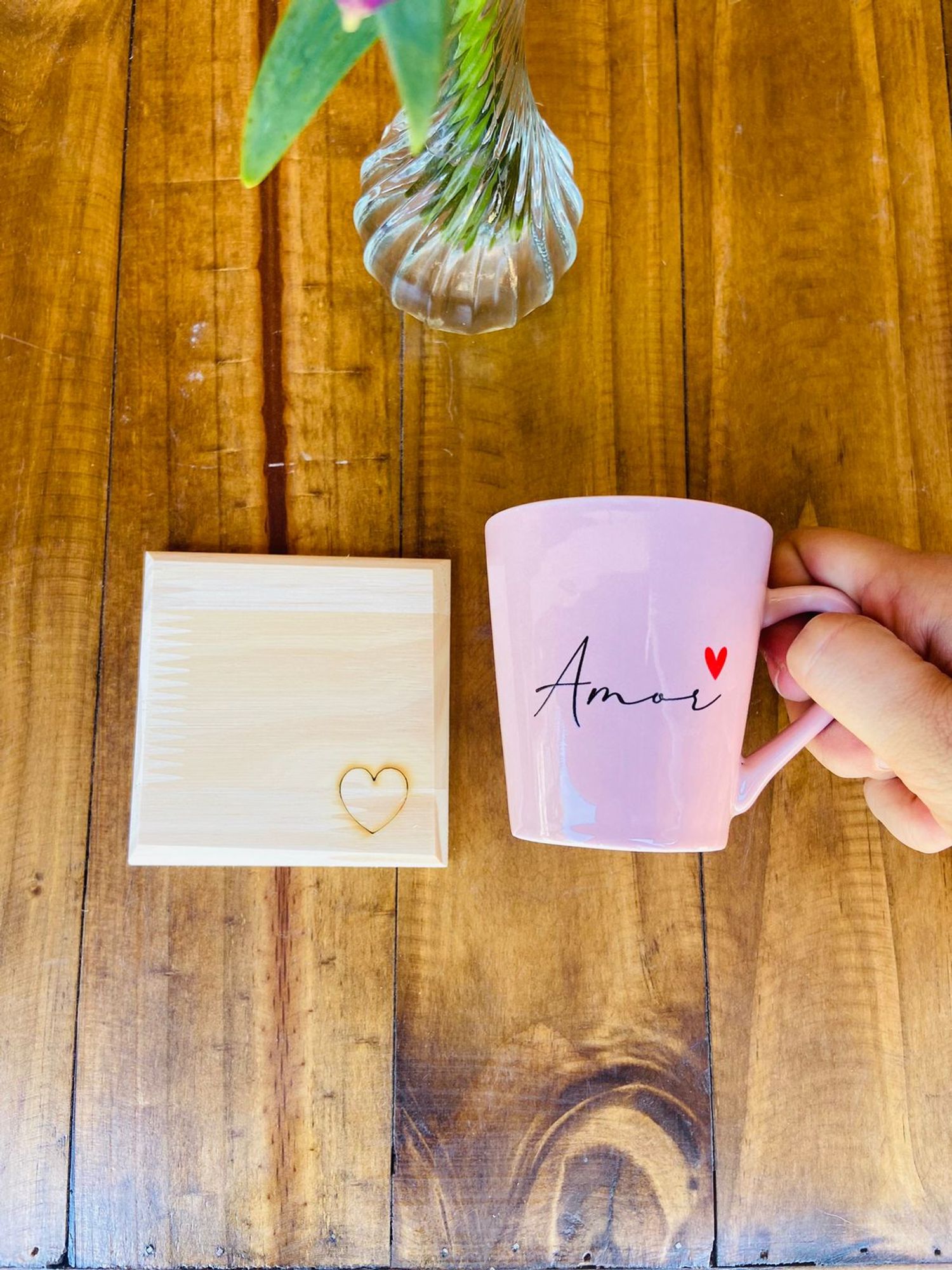 Kit Jogo 6 Xicaras / Canecas Porcelana Rosa Com Pires De Madeira Quadrado