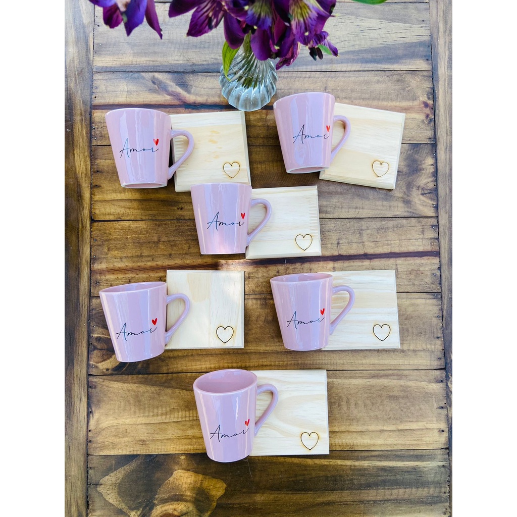Kit Jogo 6 Xicaras Canecas Porcelana Rosa Com Pires De Madeira Quadrado